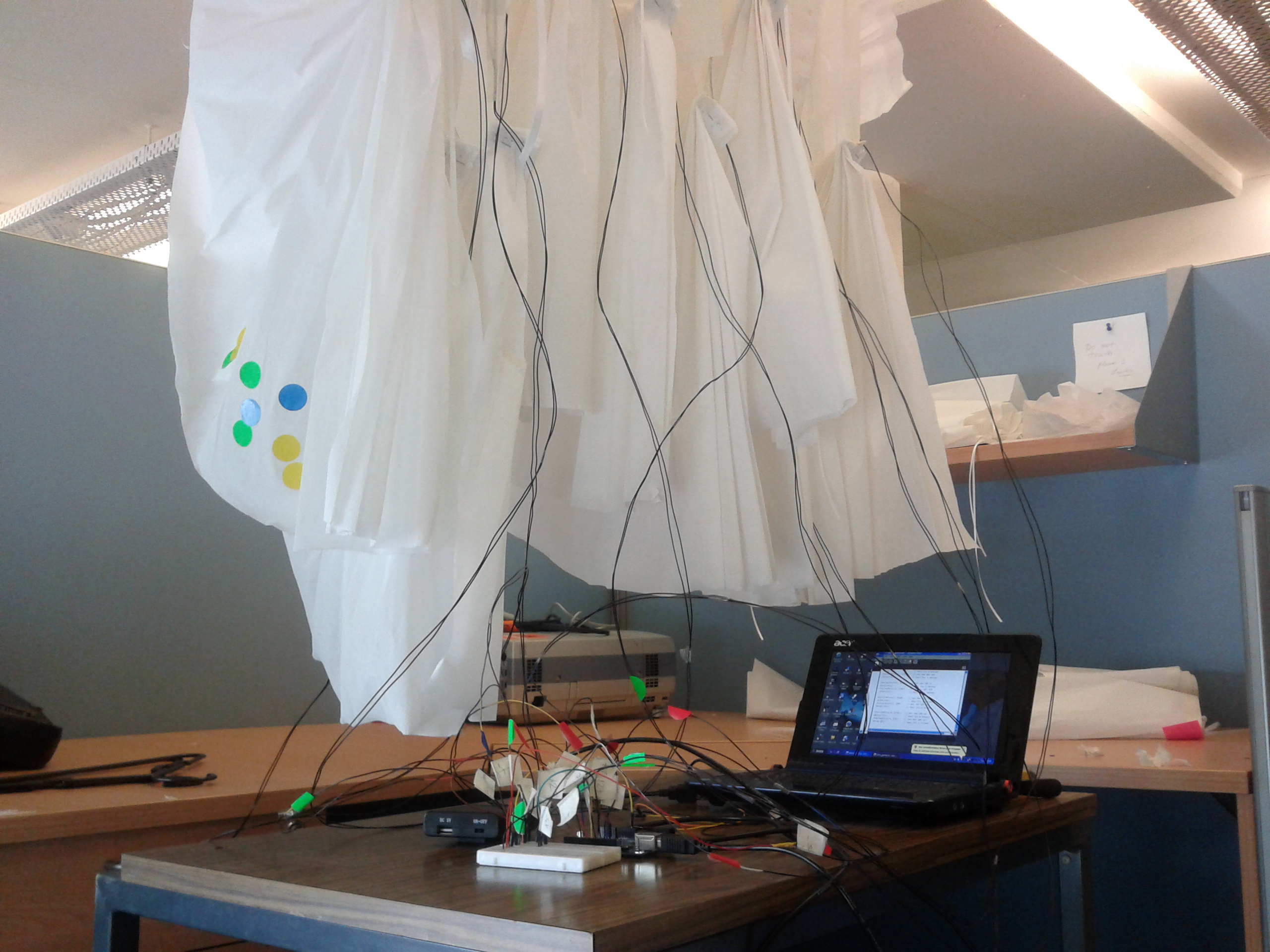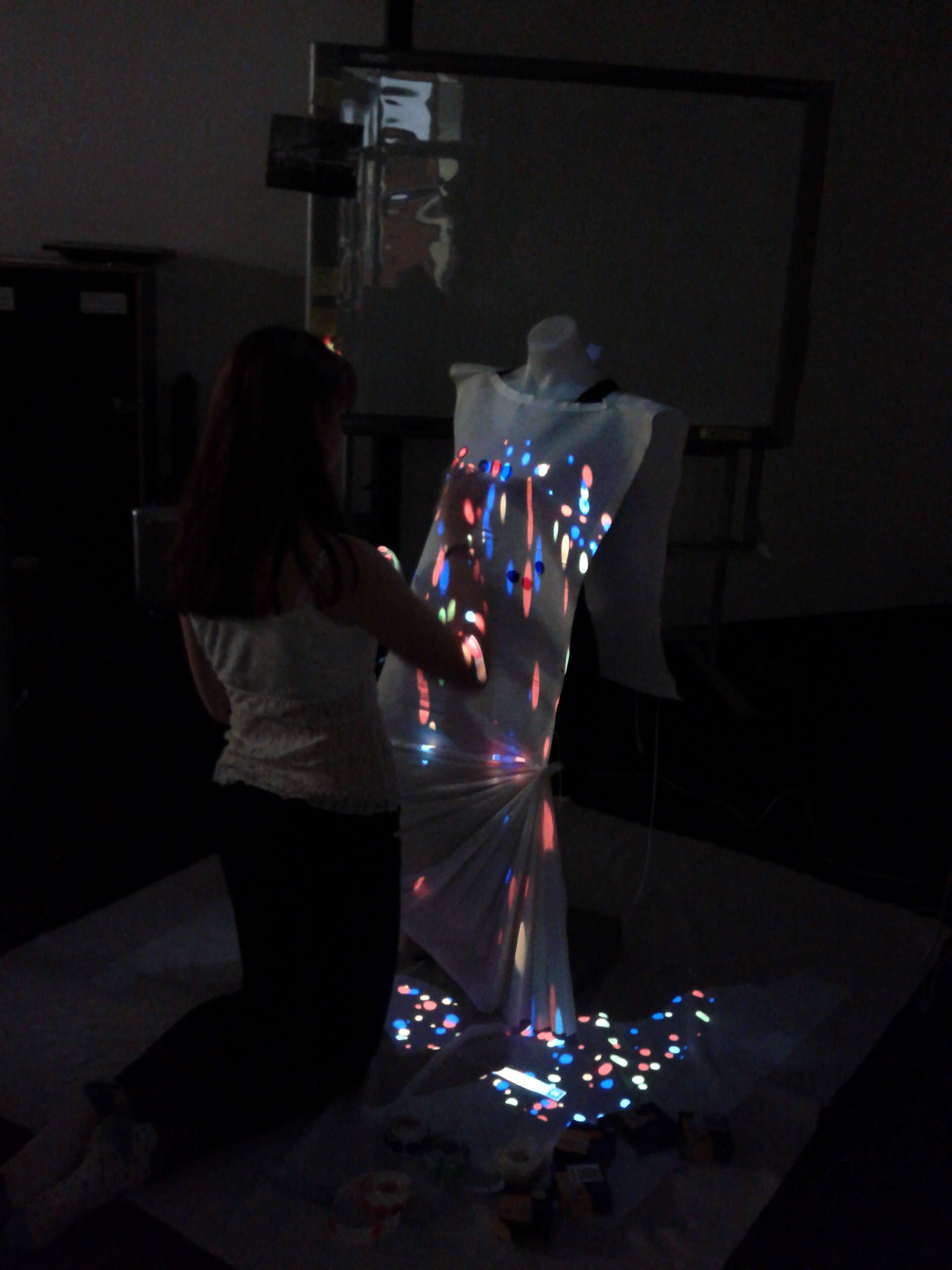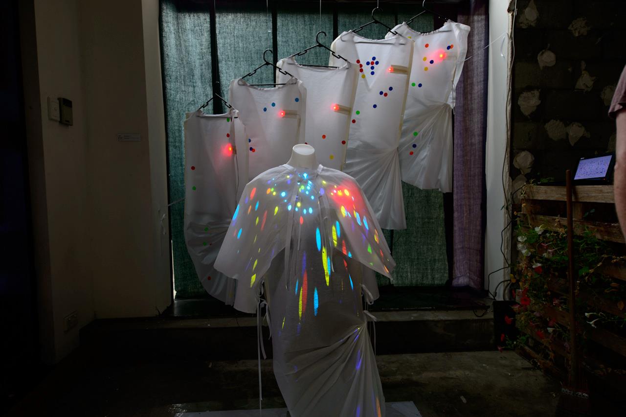 Elements: Wereable electronics (Arduino UNO + Arduino XBee + Pulse Sensor)+ Processing + Projector Paper Garments + Coloured paper dots.