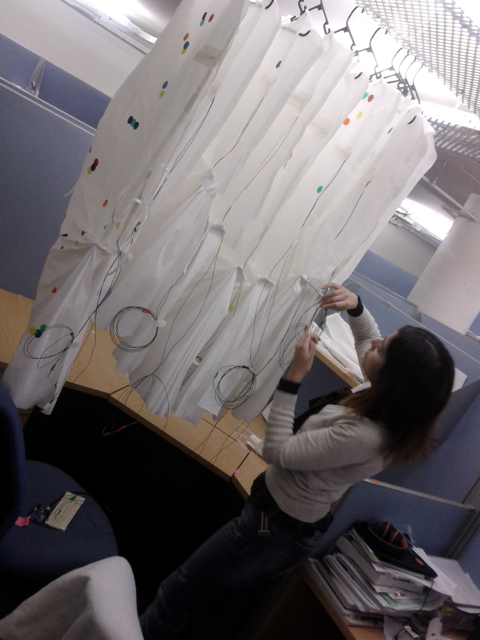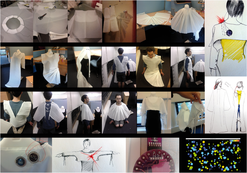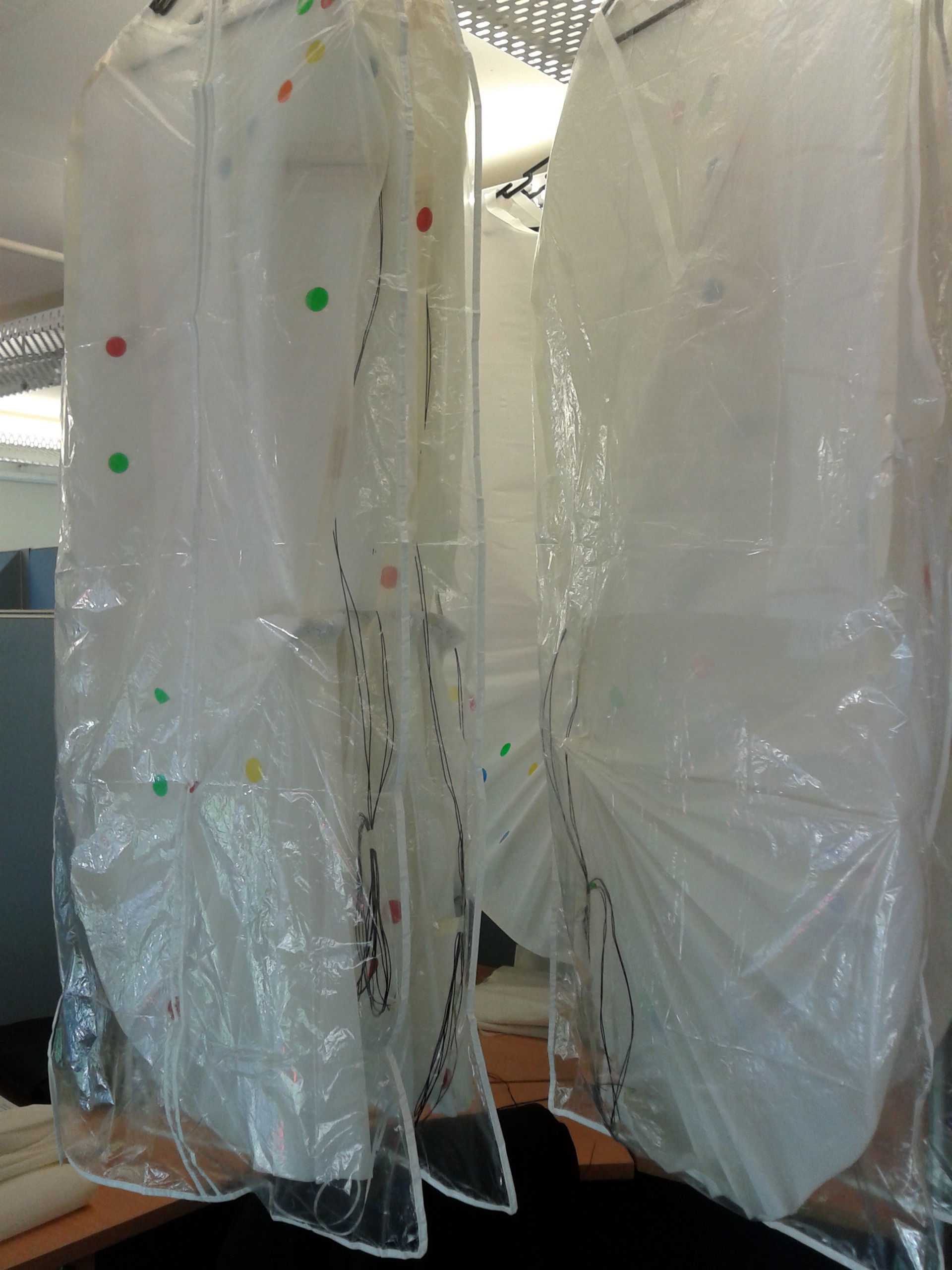 Elements: Wereable electronics (Arduino UNO + Arduino XBee + Pulse Sensor)+ Processing + Projector Paper Garments + Coloured paper dots.