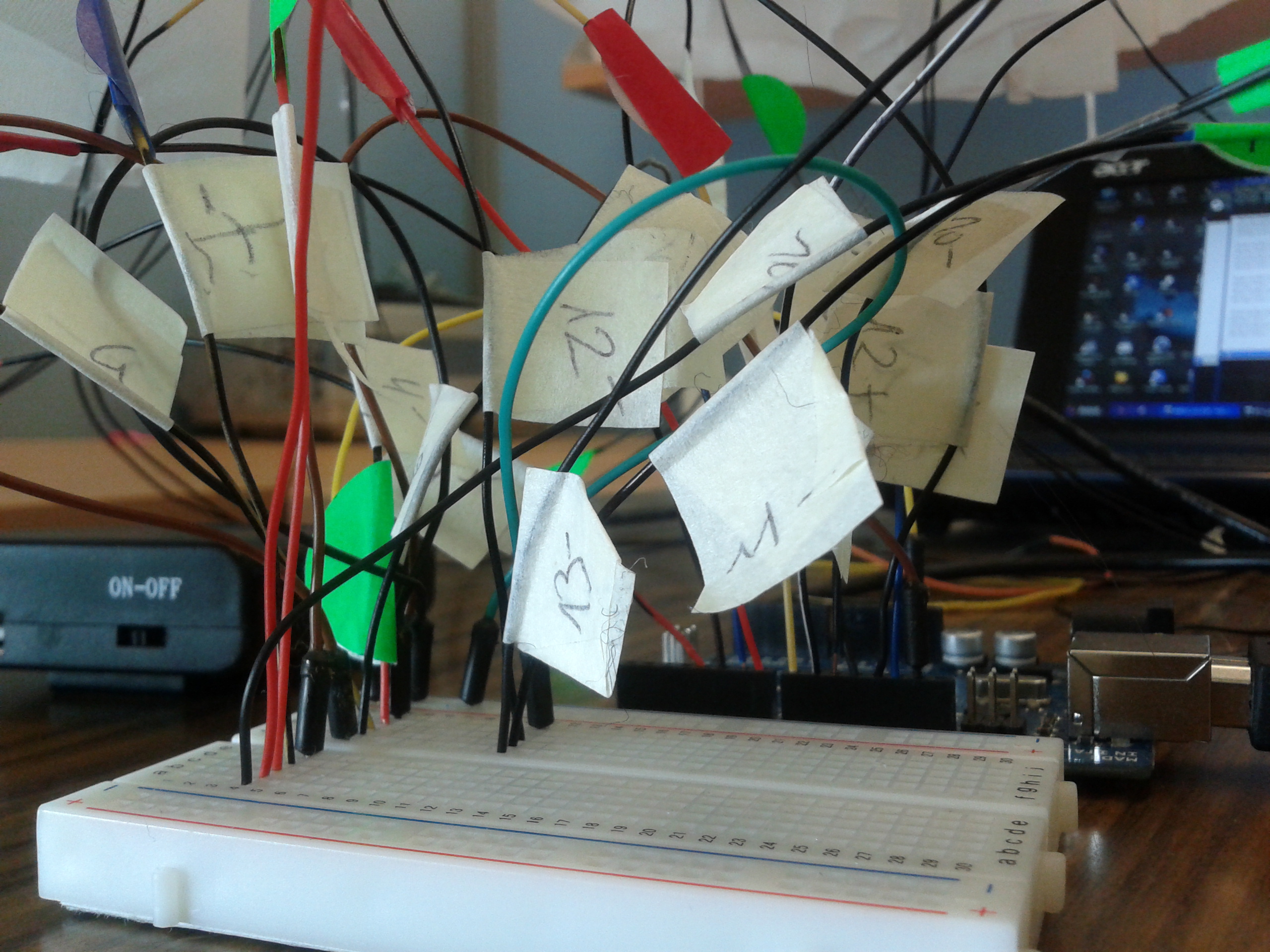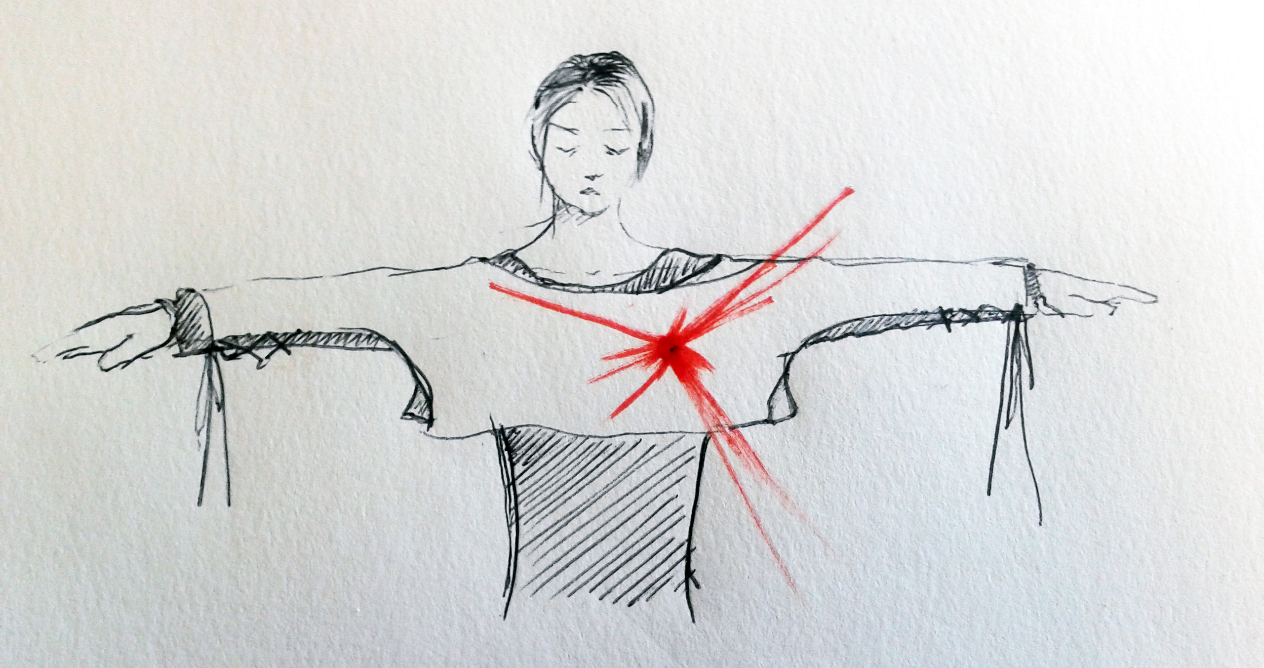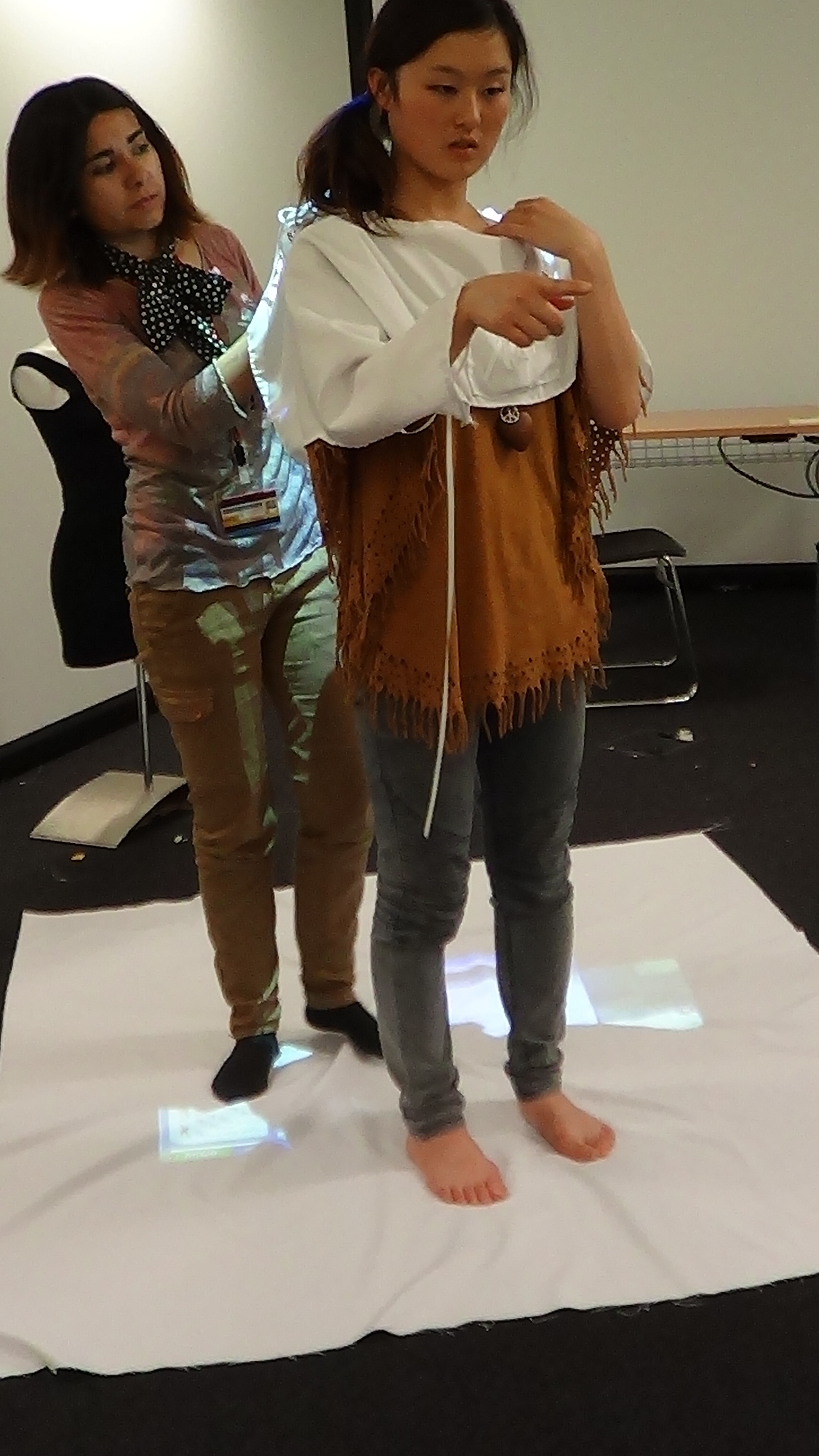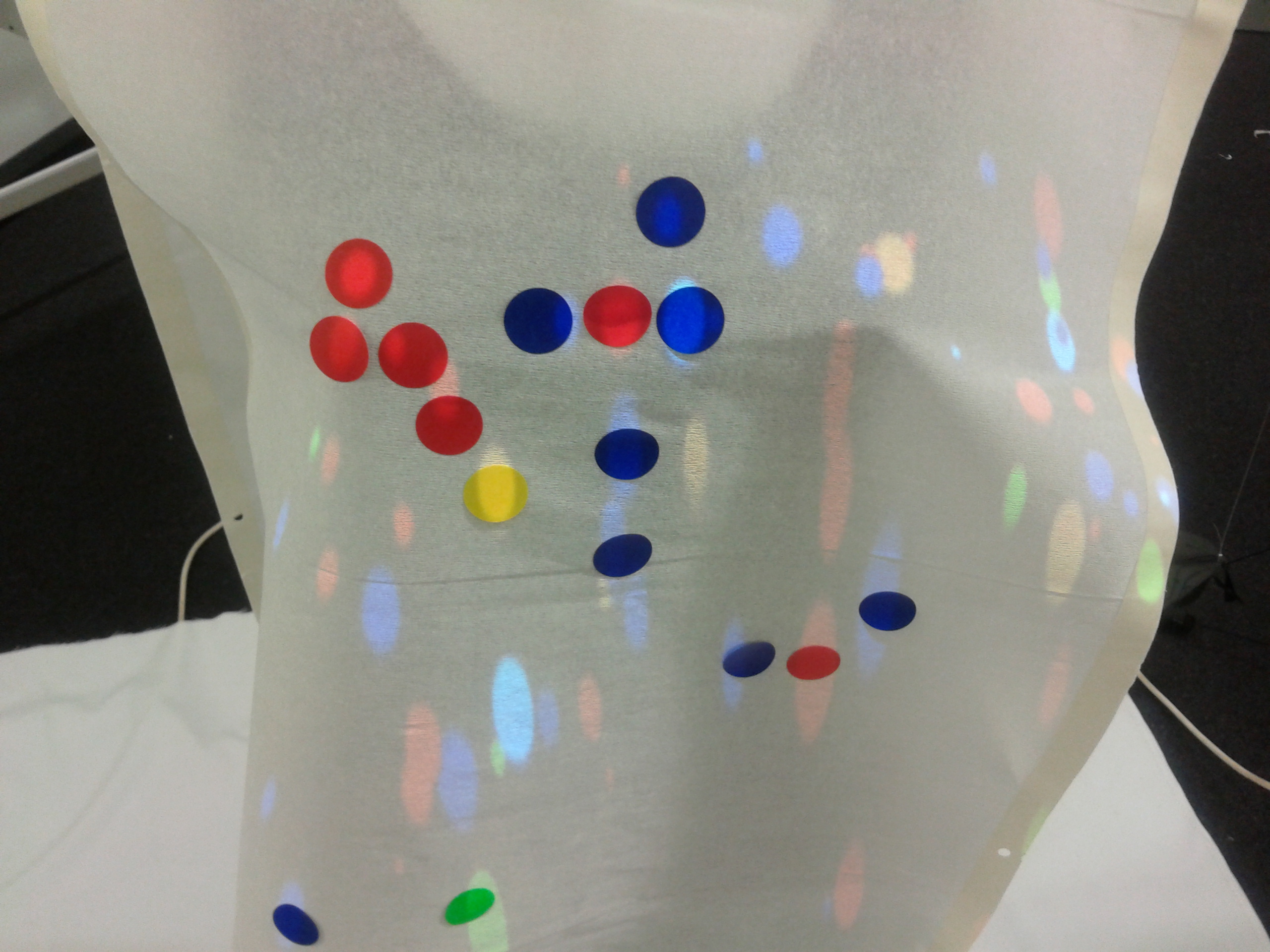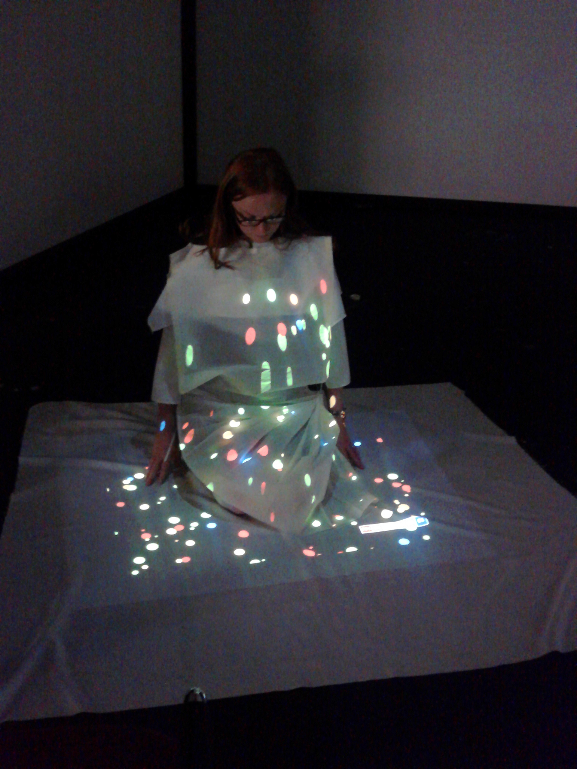 The participant wears a white paper garment, onto which the visual images are projected. The garment acts as an immersive interface, by literally enclosing and covering the body with the displayed output. The fragility of the paper garment is important for suggesting access to a temporary and potentially intense experience. A heartbeat sensor is clipped onto the earlobe, transmitting pulse data to the computer. A series of dynamically changing visual representations in the shape of simple circles are displayed according to participant’s heartbeat.