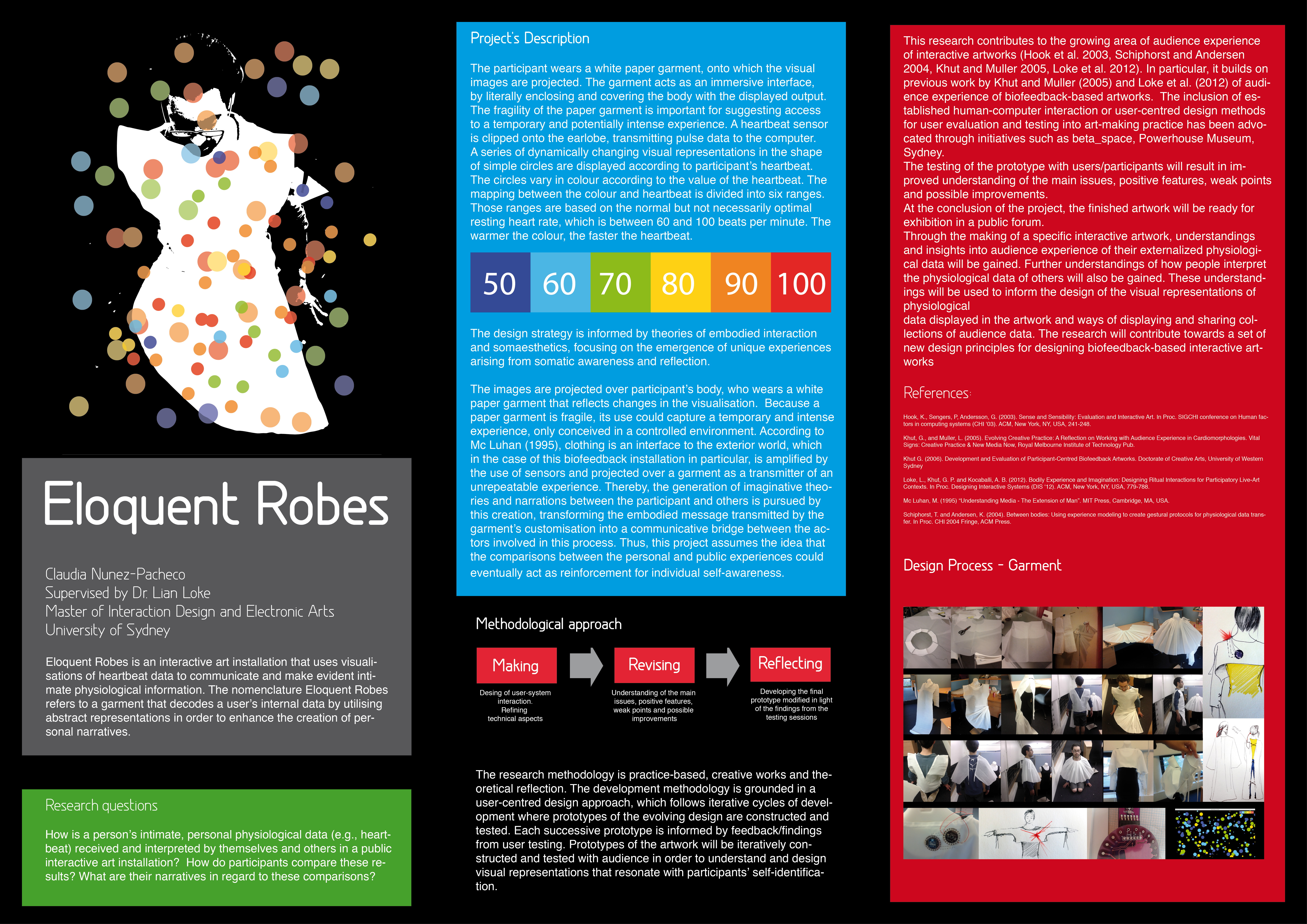 Eloquent Robes is an interactive art installation that uses visualisations of heartbeat data to communicate and make evident intimate physiological information. The nomenclature Eloquent Robes refers to a garment that decodes a user’s internal data by utilising abstract representations in order to enhance the creation of personal narratives.