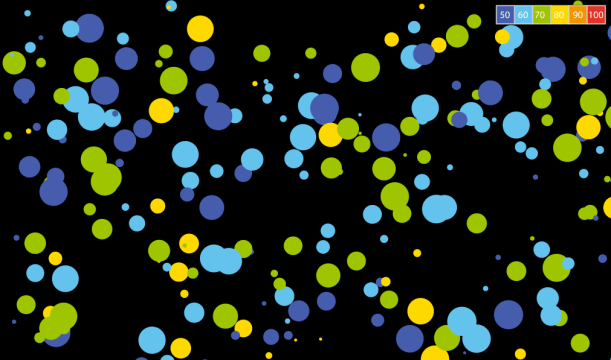 The circles vary in colour according to the value of the heartbeat. The mapping between the colour and heartbeat is divided into six ranges. Those ranges are based on the normal but not necessarily optimal resting heart rate, which is between 60 and 100 beats per minute. The warmer the colour, the faster the heartbeat.
