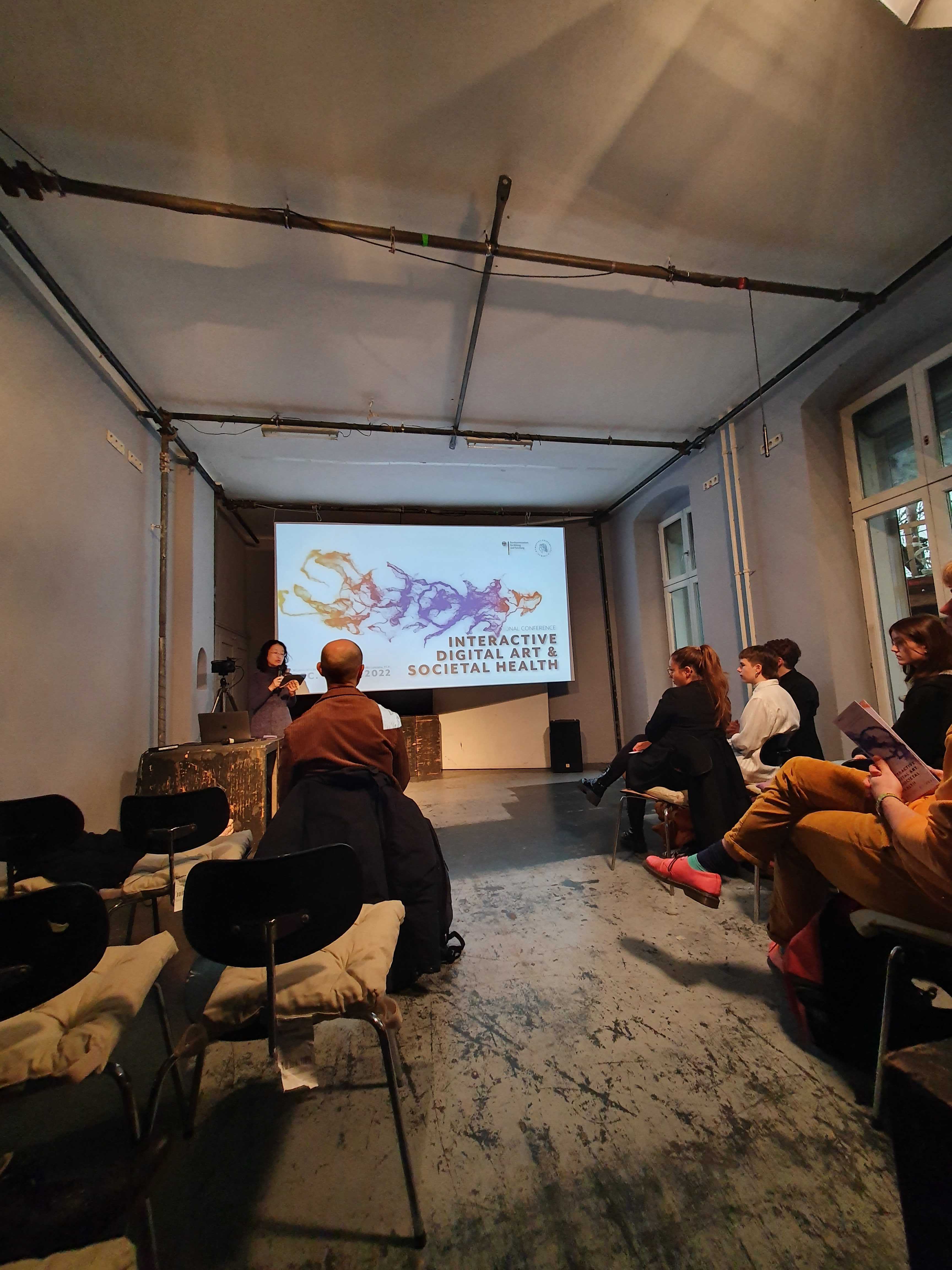I was invited as a speaker at the conference Interactive Digital Art and Societal Health, which took place in Berlin between the 2nd and 3rd of December, 2022. The series of talks and demos gathered at this event focused on discussing what roles interactive digital art could play in societal health, including the needs of individuals, communities and populations. I presented my work as a soma designer, including an introduction to our field and the intersections between our somatic methods in interaction design and artistic practice. I introduced Pulsante as a case study of how an installation designed as an educational piece became a space for respite amidst conflict and social chaos.