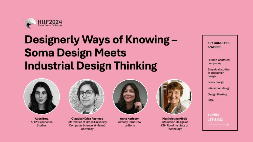 I am very happy to announce that the paper Designerly Ways of Knowing—Soma Design Meets Industrial Design Thinking has been published at the ACM Digital Library. This paper is particularly special not only because it reveals the tensions between soma design practice and industrial design in the wild but also because it derives from Alice Borg’s master’s thesis, which I had the pleasure of supervising.
