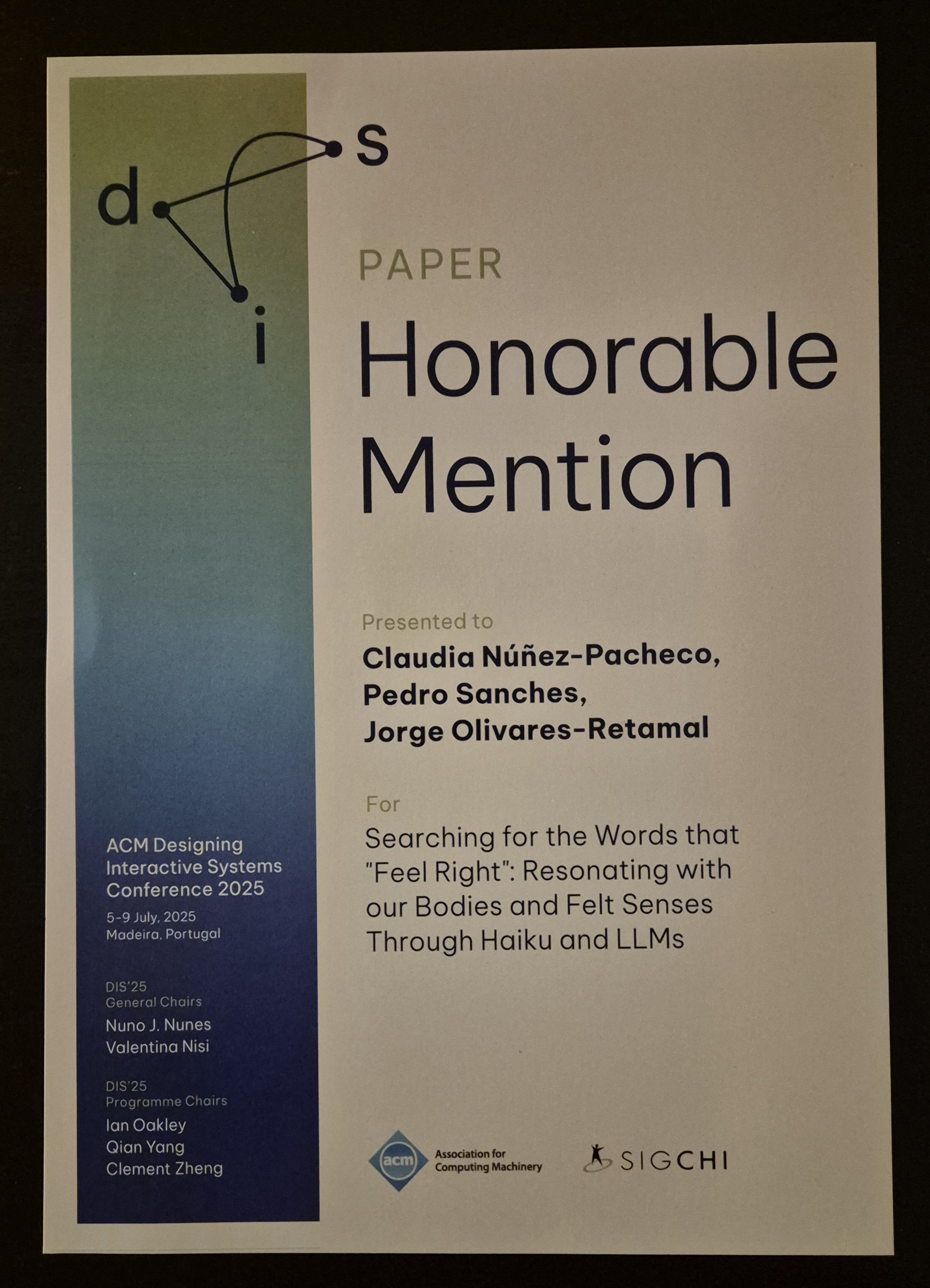 I am pleased to announce that our paper has received an Honourable Mention award at the ACM DIS 2025 Conference in Funchal, Portugal. ⭐ Our article is titled “Searching for the Words that ‘Feel Right’: Resonating with our Bodies and Felt Senses Through Haiku and Large Language Models (LLMs)”. In our research, we explore how LLMs can serve as tools for embodied introspection and reflection by conducting a series of first-person, collaborative studies involving poetry, the introspective Focusing method, and ChatGPT to guide our bodies in the search for meaning-making.